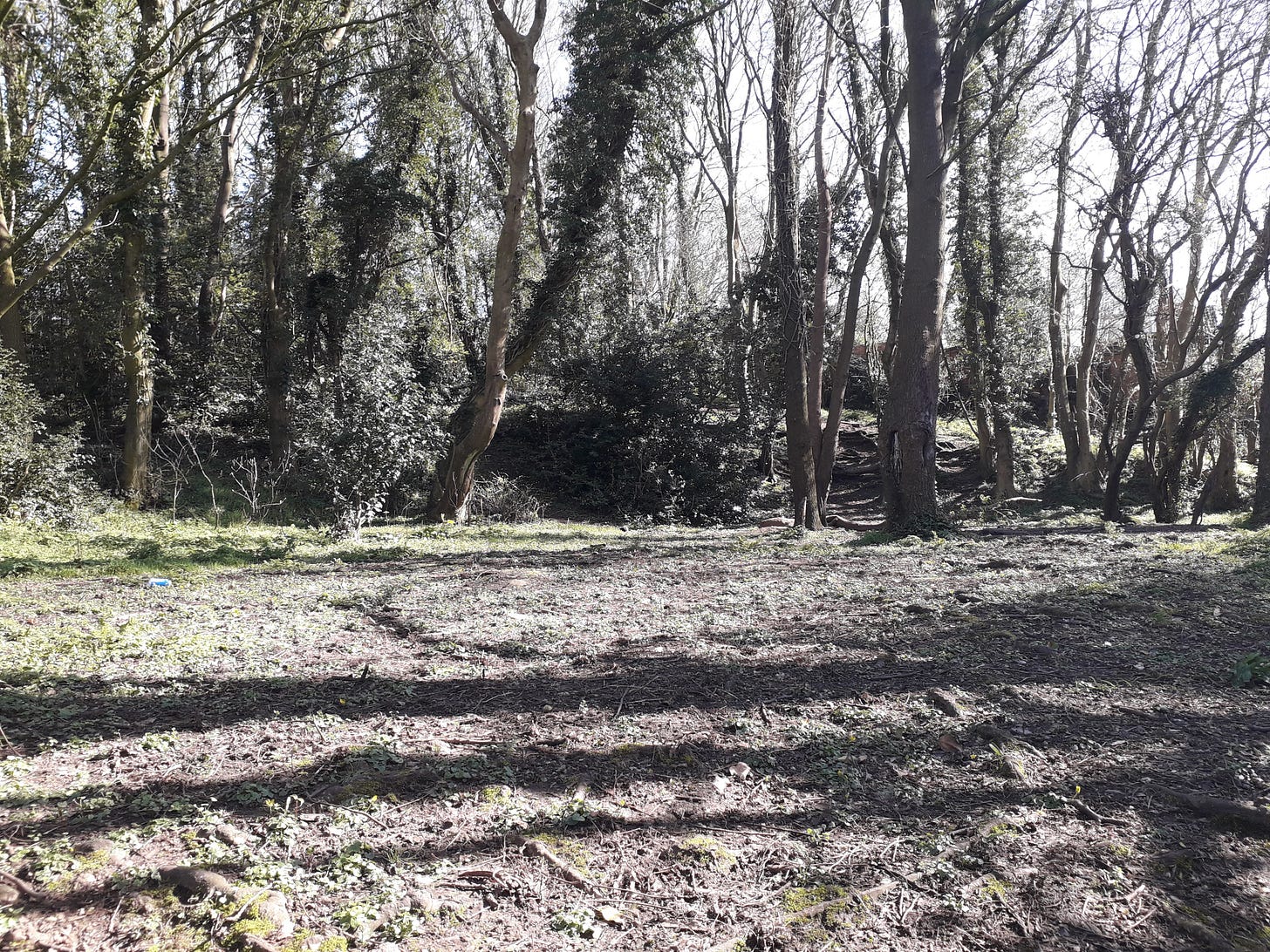 The woods were pleasant - steep, as suggested by the contour lines in the map above - and small. The trees were mature and deciduous, and there was no sign that the grove was a relatively recent phenomenon. Two large, flat clear areas were obviously the sites of the buildings shown in the map, but apart from a few stray bricks of dubious origin, there were no signs of the two buildings that existed until quite recently.