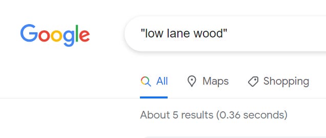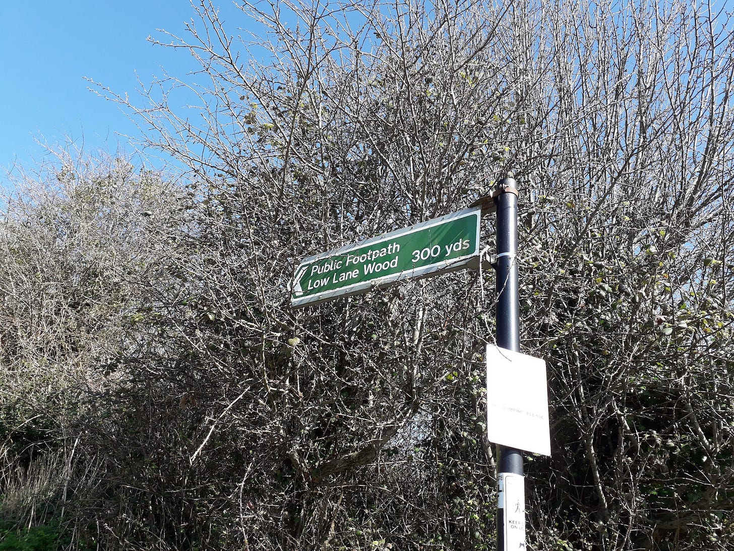A recent wander through Torrisholme1, while waiting to collect a child from a club, brought me to the footpath sign shown above. It was darkling2 and muddy so I didn’t follow the path, but I like a wood, so I gave it a Google and found something wonderful. Low Lane Wood pretty much only exists in the offline world:
